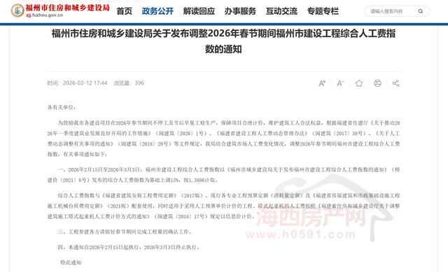 海西房产网(微信号:fjhxfcw)动静:2月12日,福州市住房和城乡扶植局下发“关于发布调整2026年春节期间福州市扶植工程分析人工费指数的通知”。